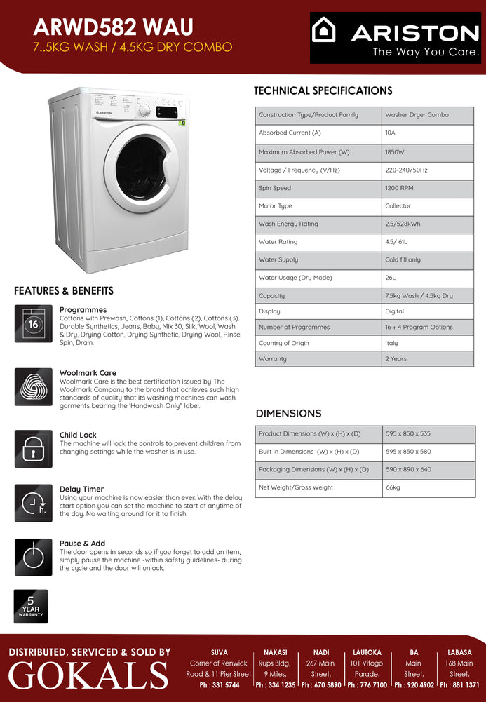 - Ariston 7.5kg Front Load Washer / 4.5kg Dry Combo (ARWD582WAU)