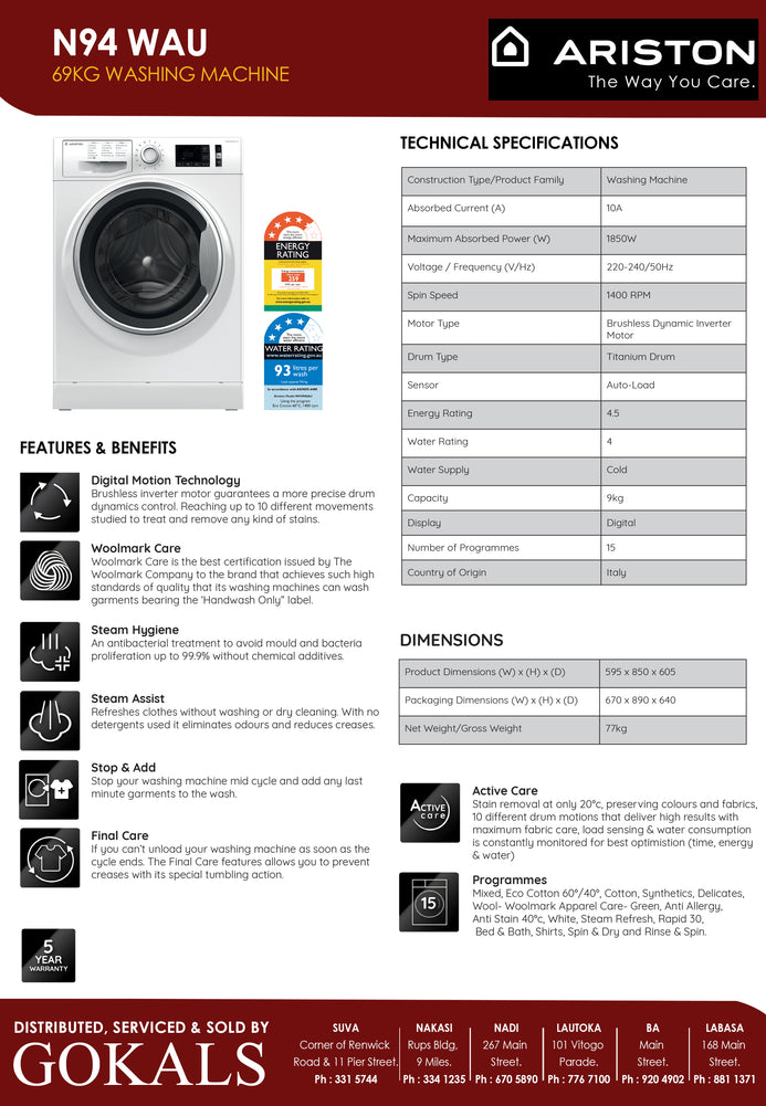 - Ariston 9kg Front Load Washing Machine (N94WAAU)