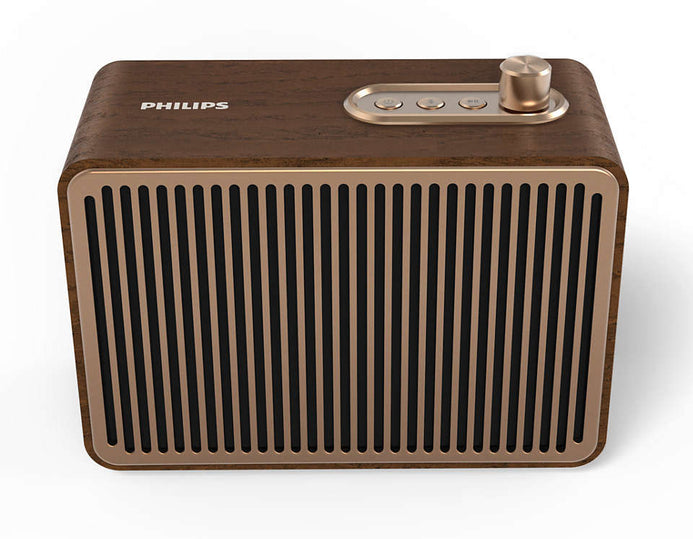 This retro-style Bluetooth speaker looks like it's straight out of the 1950s. The vintage wooden cabinet. The brass-toned volume control knob and speaker grille. Details from back when jazz had the edge and rock and roll was just beginning.