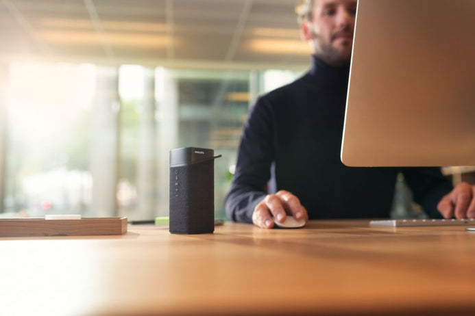 Morning tunes in the bathroom. Inspiring podcasts in the home office. With its wool-blend speaker fabric and embossed buttons, this stylish Bluetooth speaker always looks the part. You get surprisingly rich sound, and 10 hours play time.