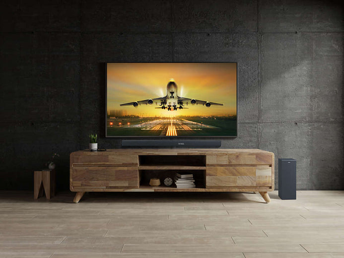 This soundbar brings 300W of rich sound to everything you watch, and every track you love. 3.1 channels fill any room with spellbinding soundtracks, thunderous effects, and crystal-clear dialogue. The wireless subwoofer adds impact to every explosion and every beat.