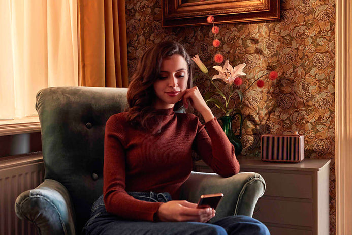 A play/pause button on top of the speaker easily controls your music, while volume up/down is via the retro-style knob. When the speaker is on, press the power button to switch between sources. The wireless range is 10 m: perfect for lazy afternoons in the garden or park.